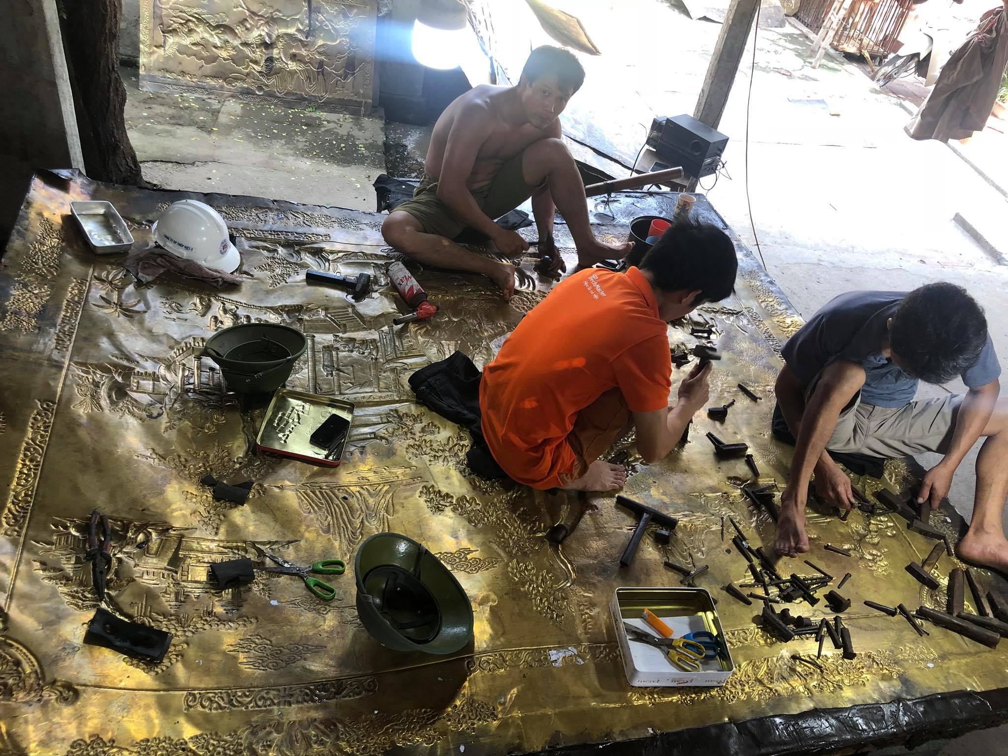 Từ đó điều khiển lực đập cho vừa đủ, chỉ hơi quá tay, miếng đồng sẽ bị thủng. Nhưng nếu vì thế mà sử dụng những miếng đồng quá dày, hoa văn hiện lên sẽ không được “căng” và sắc nét.